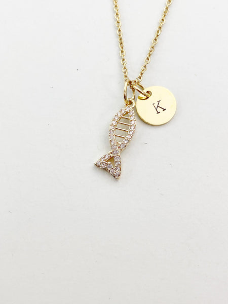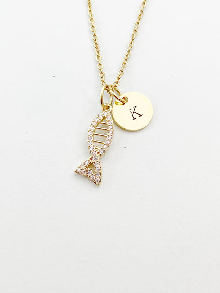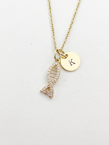 This is a gold -tone fish charm with hand stamped initial charm on brass or stainless steel 18 inches chain.