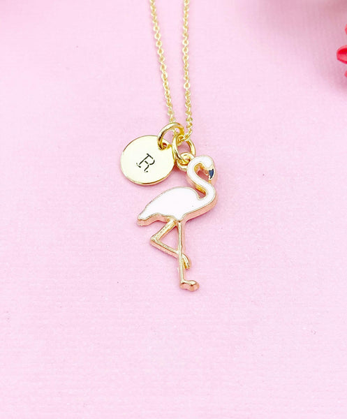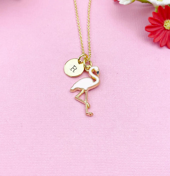 This is a gold-tone Flamingo charm with hand stamped initial charm on stainless steel necklace.