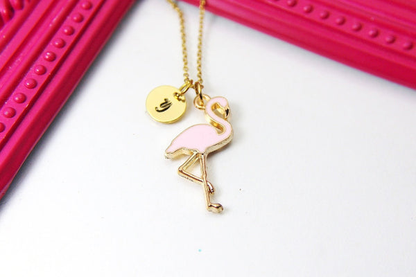 Gold Flamingo Charm Necklace, Flamingo Bird Charm Necklace, Pink Bird Jewelry, Personalized Customized Monogram Initial Necklace,