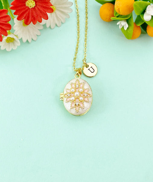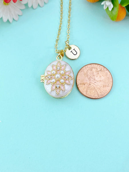 This is gold tone locket charm with hand stamped initial charm on brass/stainless steel 18 inches chain.