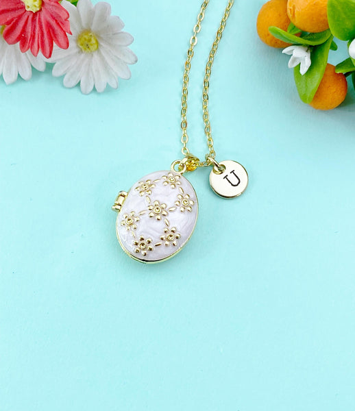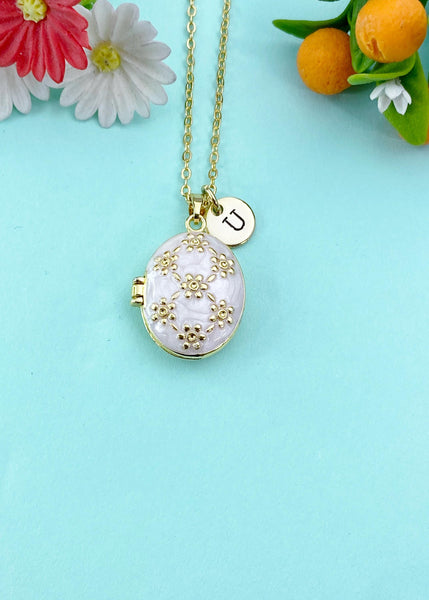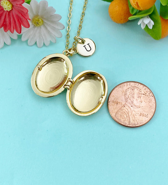 This is gold tone locket charm with hand stamped initial charm on brass/stainless steel 18 inches chain.