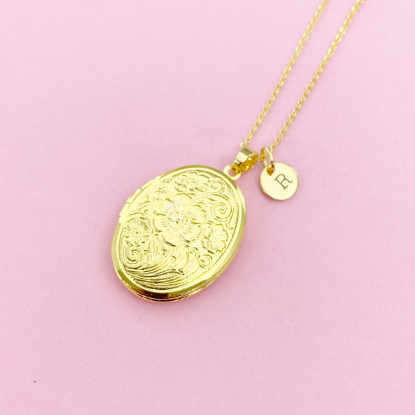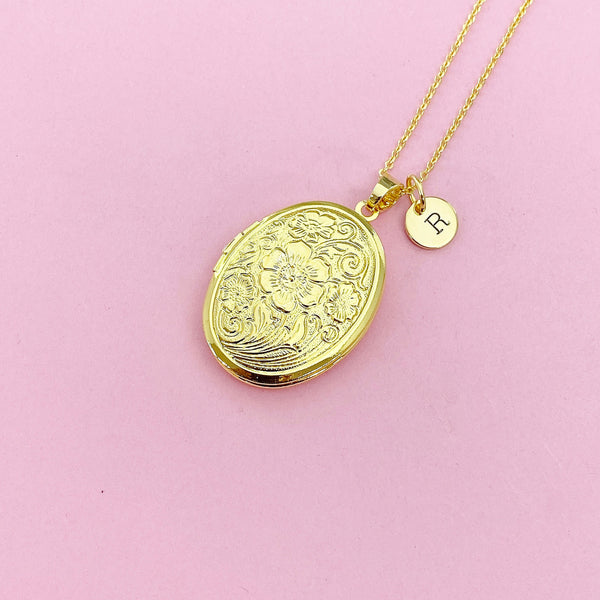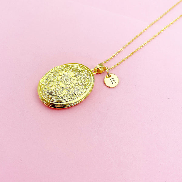 This is gold tone locket charm with hand stamped initial charm on brass or stainless-steel chain.