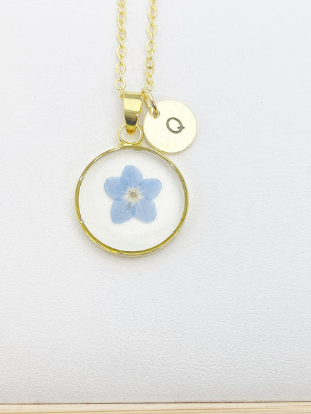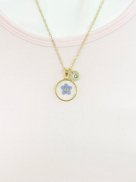This is a gold-tone real press forget me not resin charm with hand stamped initial charm on brass or stainless steel chain.