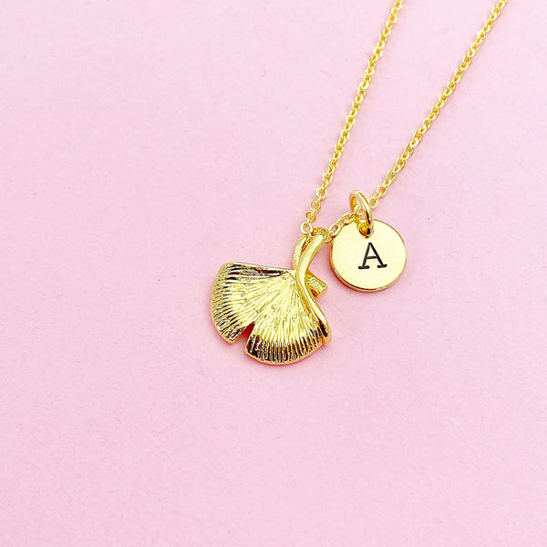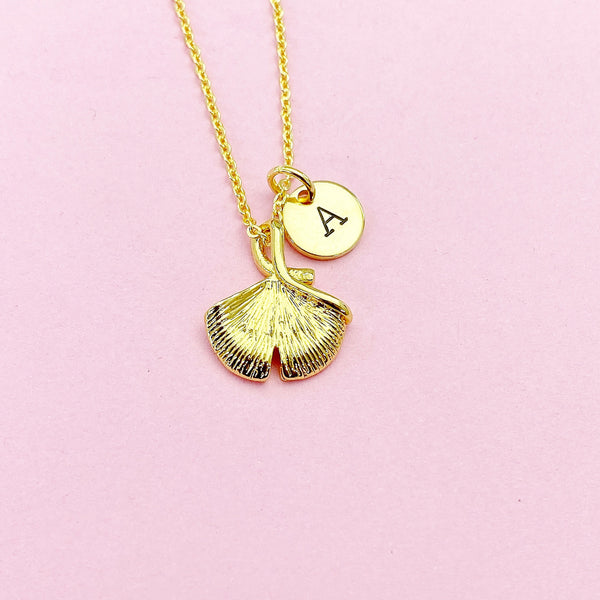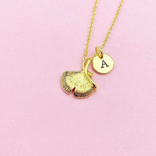 This is gold tone ginkgo leaf charm with hand stamped initial charm on brass/stainless steel 18 inches chain.