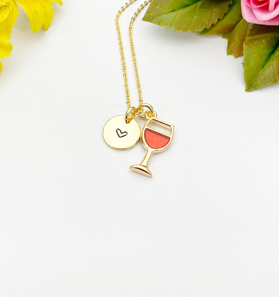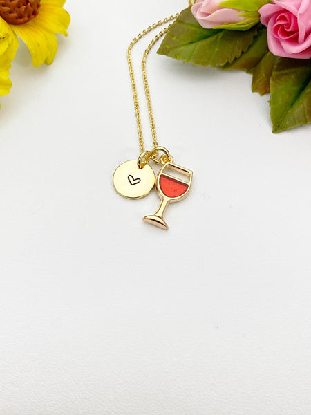 This is a gold-tone red wine glass charm with hand stamped initial charm on brass or stainless steel 18 inches chain.