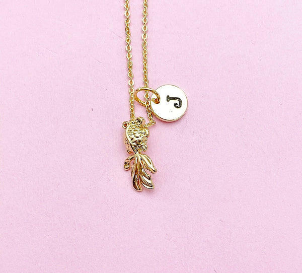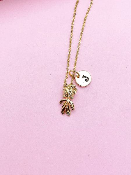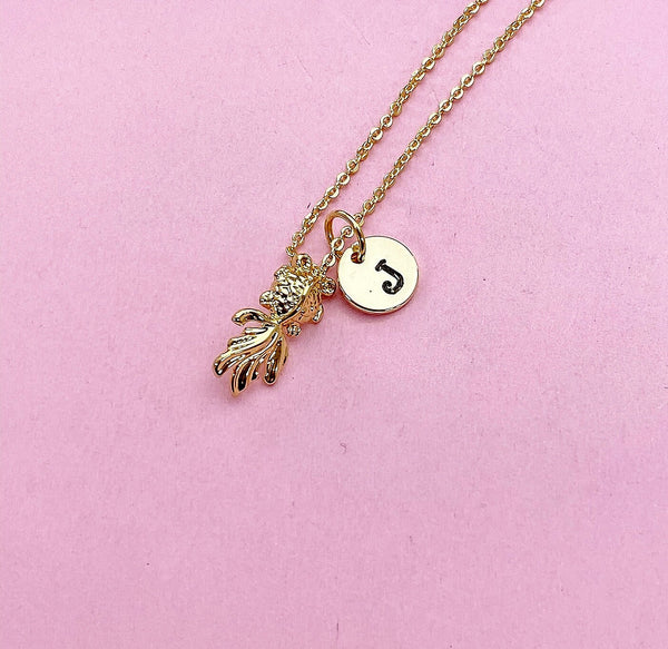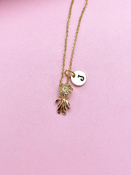 This is gold tone goldfish charm with hand stamped initial charm on brass or stainless-steel chain.