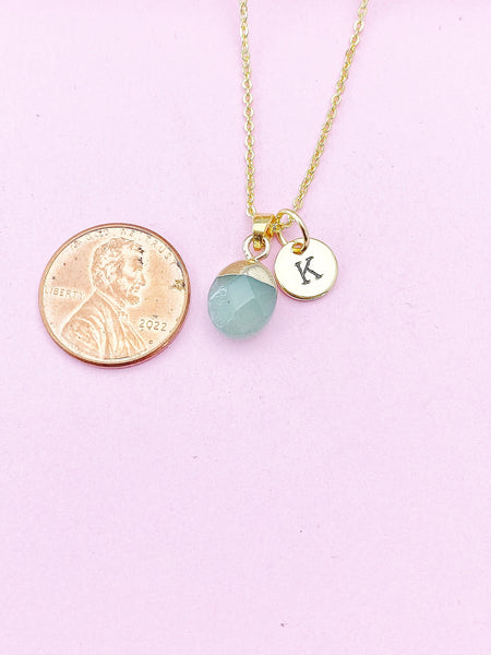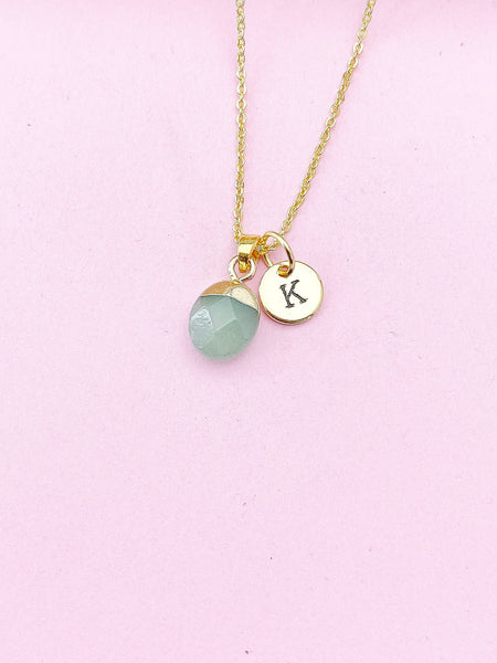 This is gold tone Green Aventurine charm with hand stamped initial charm on brass or stainless-steel chain.