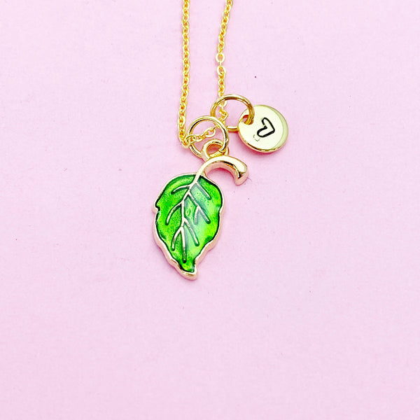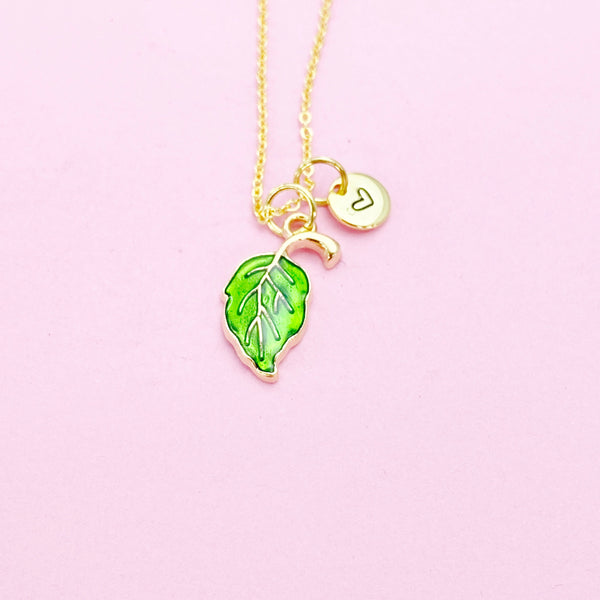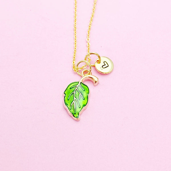 This is gold tone leaf charm with hand stamped initial charm on brass or stainless-steel chain.