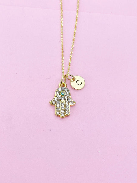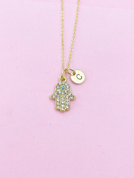 This is a gold -tone Hamsa with Evil Eye charm with hand stamped initial charm on brass/stainless steel 18 inches chain.