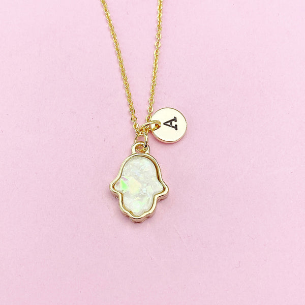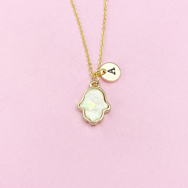 This is gold tone hamsa hand charm with hand stamped initial charm on brass or stainless-steel chain.