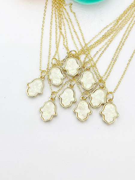Gold-tone white imitation opal hamsa pendant with hand stamps initial charm on stainless steel chain