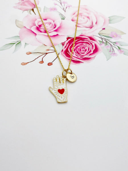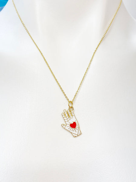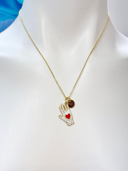 This is an alloy hand with red heart charm with hand stamped initial charm on a stainless-steel or brass chain.