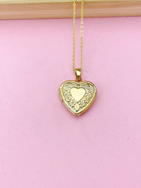 This is gold tone heart locket on brass or stainless-steel chain. *We do not provide the service of adding photos to locket.*