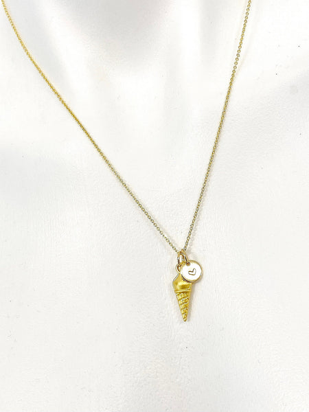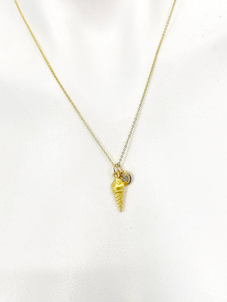 This is a gold -tone Ice Cream charm with hand stamped initial charm on brass/stainless steel 18 inches chain.