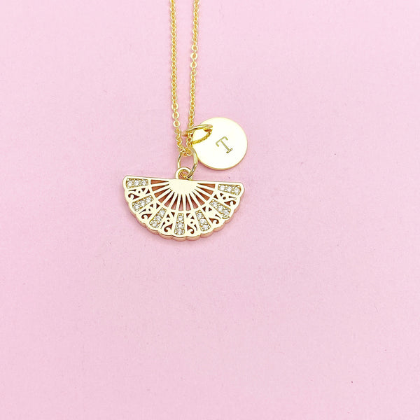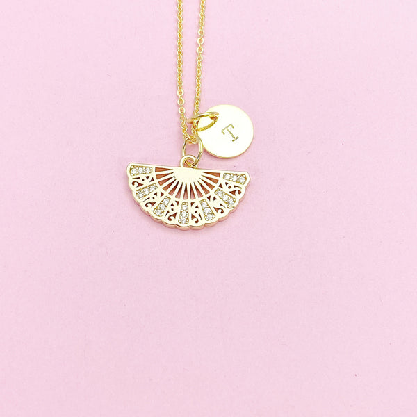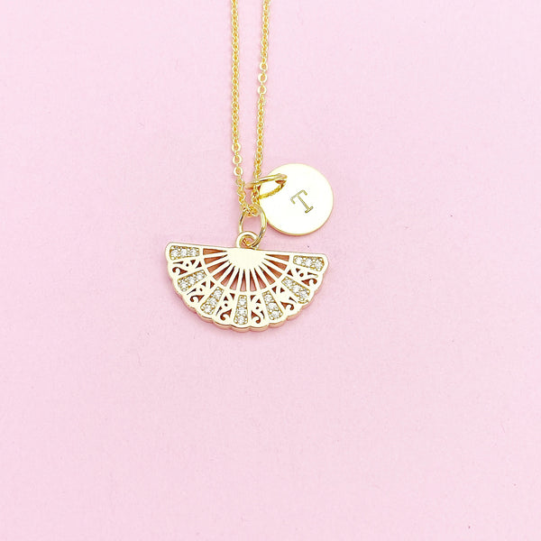 This is gold tone Folding Fan charm with hand stamped initial charm on brass or stainless-steel chain.