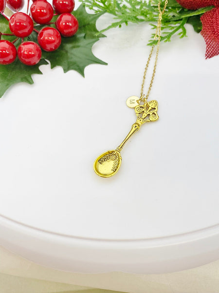 This is a gold-tone Kitchen Utensil charm with hand stamped initial charm on 18 inches chain.