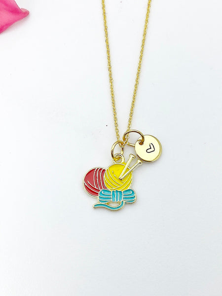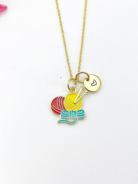 This is gold tone Ball of Yarn charm with hand stamped initial charm on brass/stainless steel 18 inches chain.