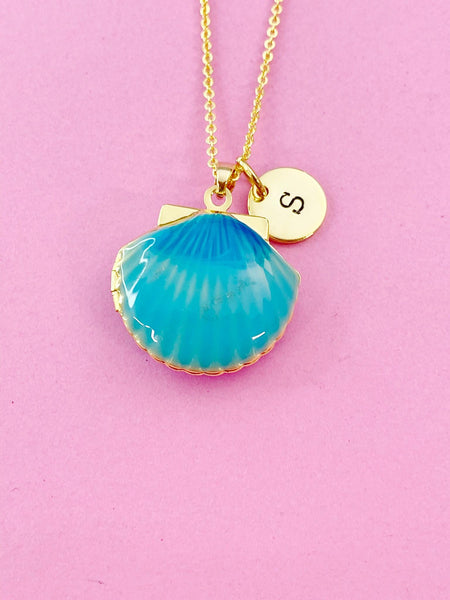 This is gold tone shell locket charm with hand stamped initial charm on brass/stainless steel 18 inches chain.