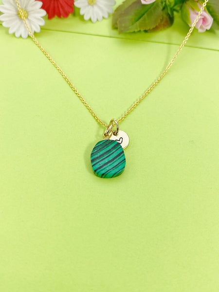 This is gold tone Malachite charm with hand stamped initial charm on brass/stainless steel 18 inches chain.