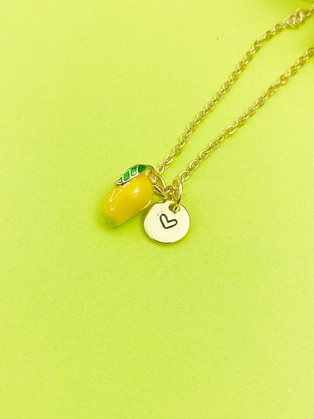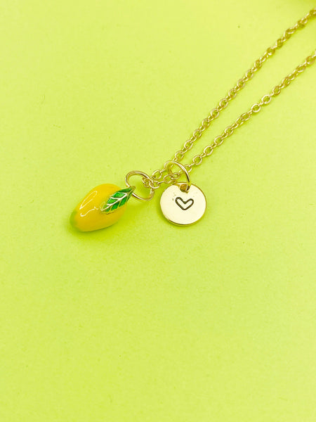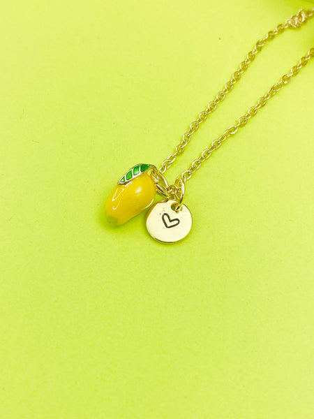 This is gold tone yellow mangoes charm with hand stamped initial charm on brass/stainless steel 18 inches chain.