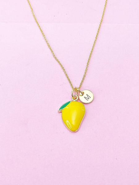 This is gold tone mango charm with hand stamped initial charm on brass or stainless-steel chain.
