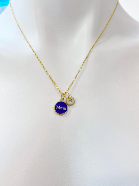 This is an alloy mom charm with hand stamped initial charm on a stainless-steel or brass chain.