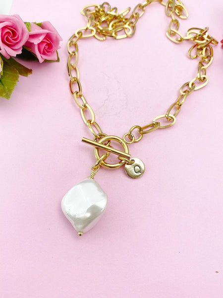 This is a gold or silver-tone natural freshwater shell charm on stainless-steel paperclip chain with toggle clasps.