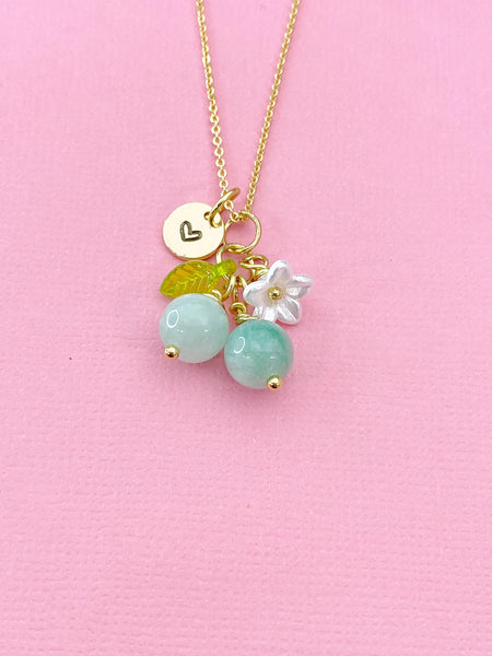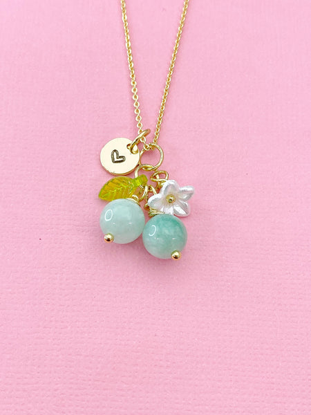 Gold Natural Jade Necklace, Green Jade Fruit Green Leaf White Flower Foodie Gemstone Jewelry, N5946