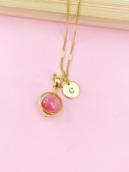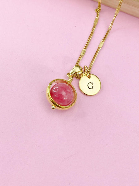 This is a gold-tone Natural Quartz Imitation Rhodochrosite charm with hand stamped initial charm on stainless-steel chain.