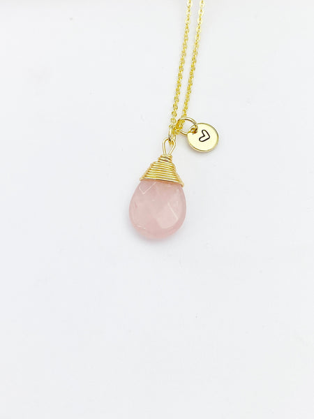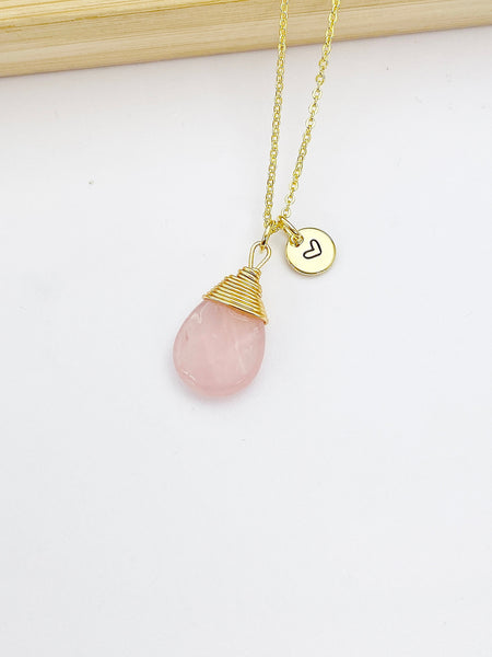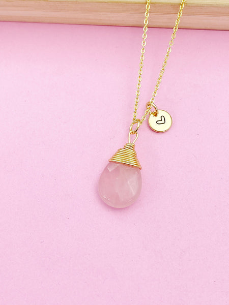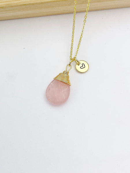 This is a gold tone wire wrap natural Rose Quartz charm with hand stamped initial charm on brass or stainless steel 18 inches chain.