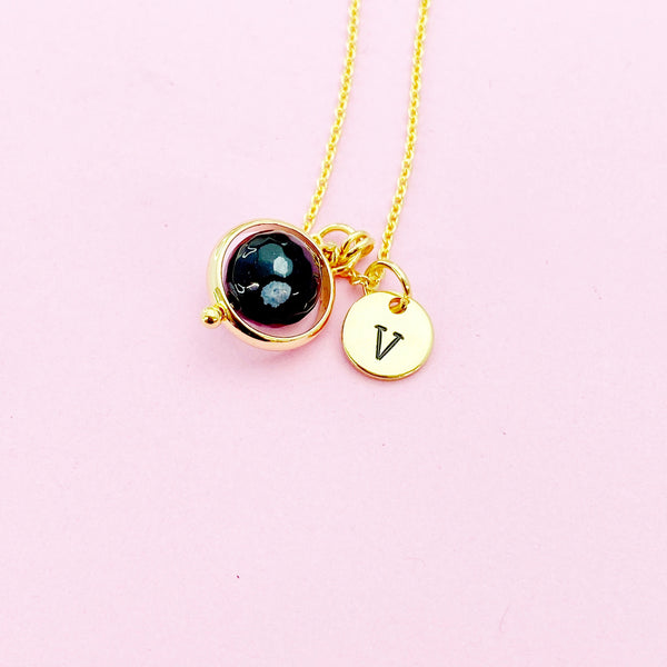 This is gold tone Snowflake Obsidian charm with hand stamped initial charm on brass or stainless-steel chain.