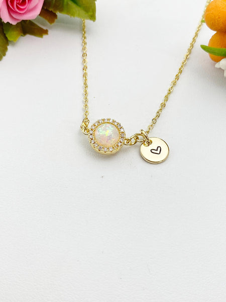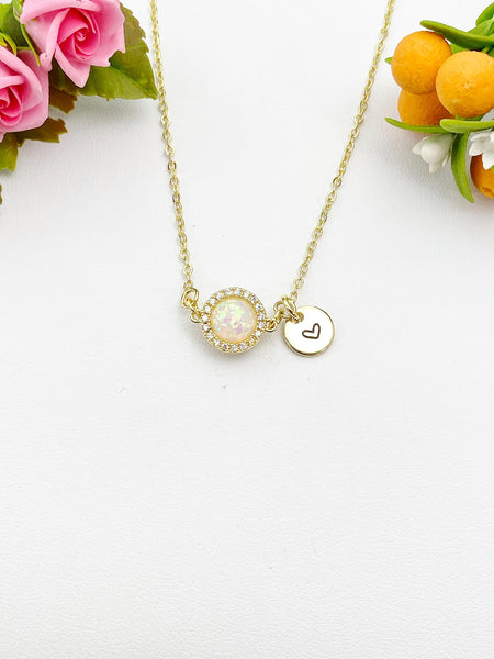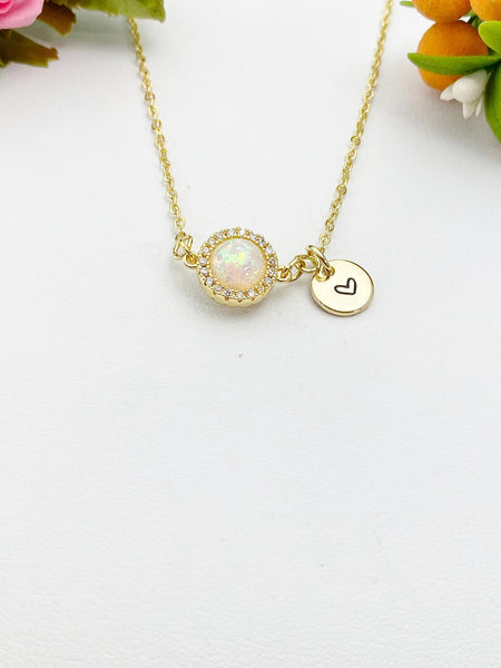 This is a gold -tone Opal with hand stamped initial charm on brass or stainless steel 18 inches chain.