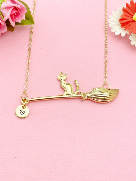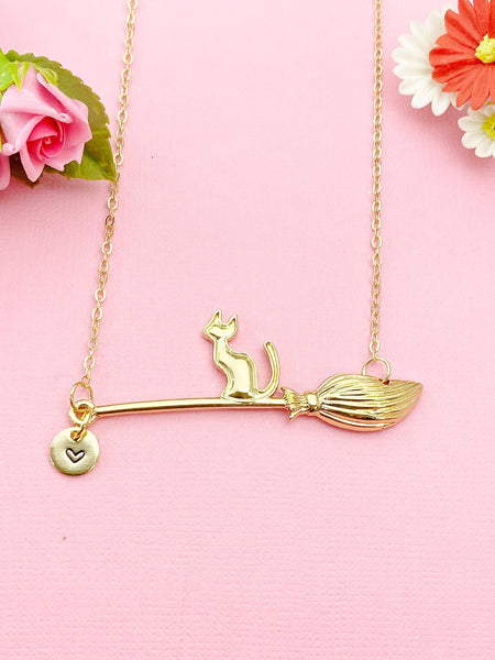 This is a gold -tone Cat Sit on Witches Broom with hand stamped initial charm on brass or stainless steel 18 inches chain.