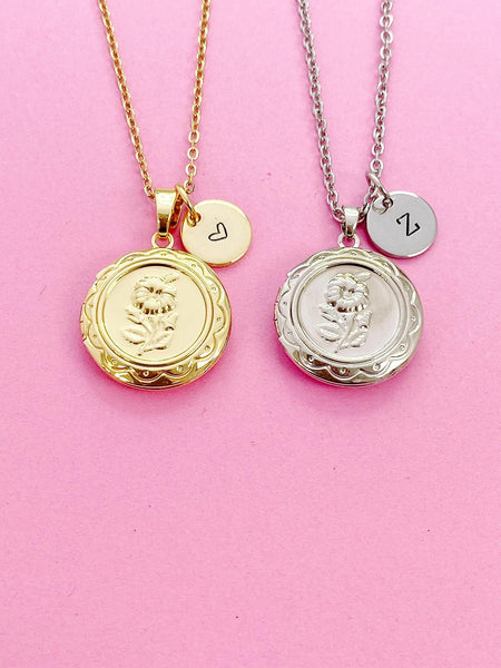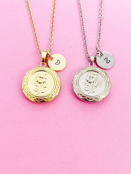 This is gold or silver tone locket charm with hand stamped initial charm on brass or stainless-steel chain. *We do not provide the service of adding photos to locket. *