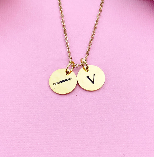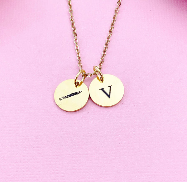 This is an engraving oboe and initial on stainless steel charm on gold over stainless steel necklace or tarnish resistant stainless steel necklace