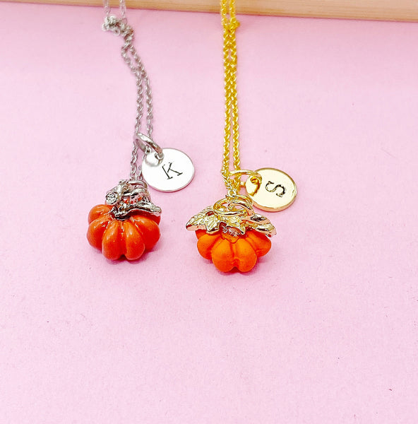 This is a silver or gold tone pumpkin charm with hand stamped initial charm on brass or stainless-steel chain.