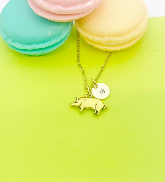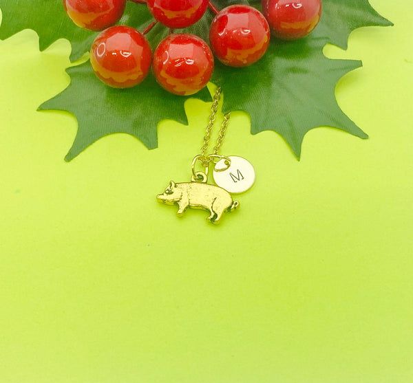 This is gold tone pig charm with hand stamped initial charm on brass/stainless steel 18 inches chain.