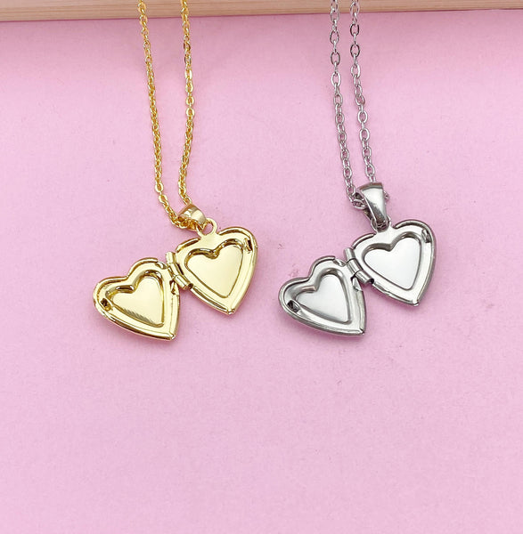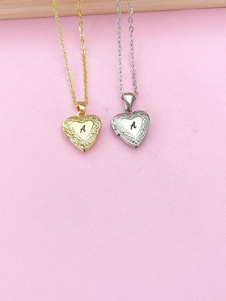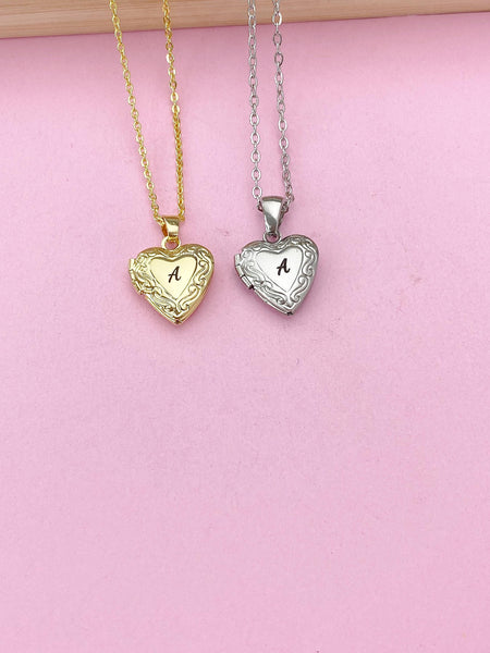 This is a unique engraving initial on stainless steel or brass heart locket charm on 18 inches stainless steel necklace chain.