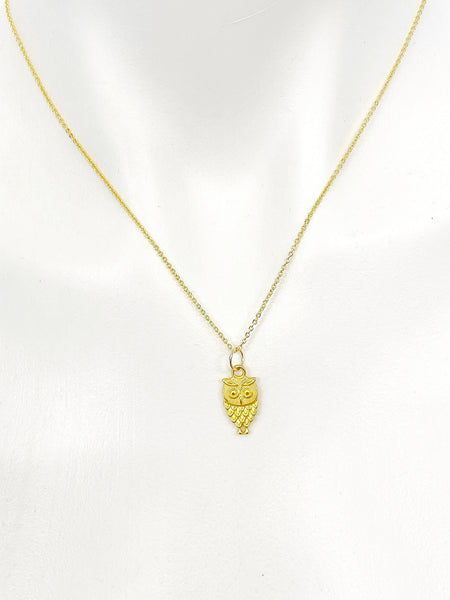 This is a gold -tone Owl charm on brass/stainless steel 18 inches chain.