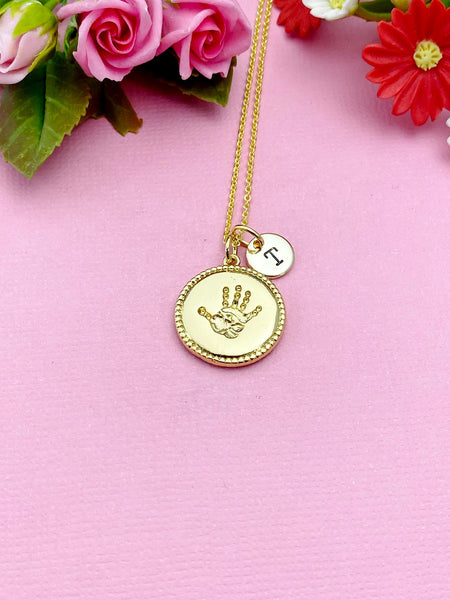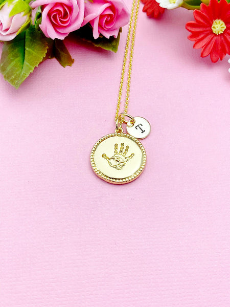 This is a gold-tone palm charm with hand stamped initial charm on brass/stainless steel 18 inches chain.