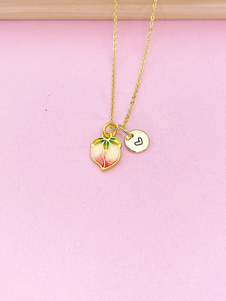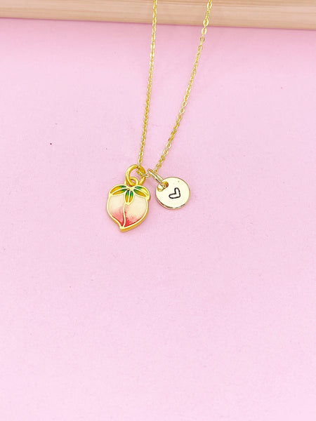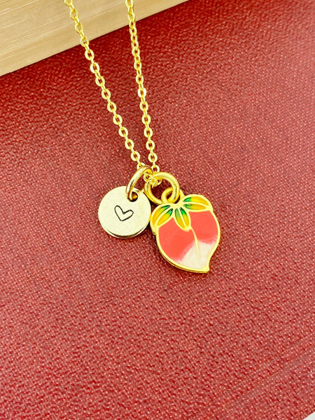 This is gold tone peach charm with hand stamped initial charm on brass/stainless steel 18 inches chain.