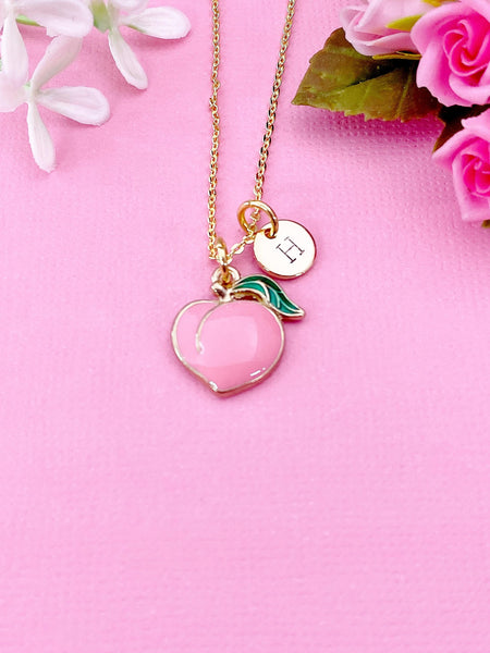 This is a gold -tone peach charm with hand stamped initial charm on brass or Tarnish Resistant stainless steel 18 inches chain.