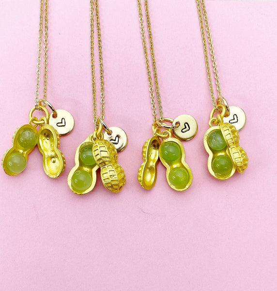 This is a gold -tone Peanut charm with hand stamped initial charm on brass/stainless steel 18 inches chain.