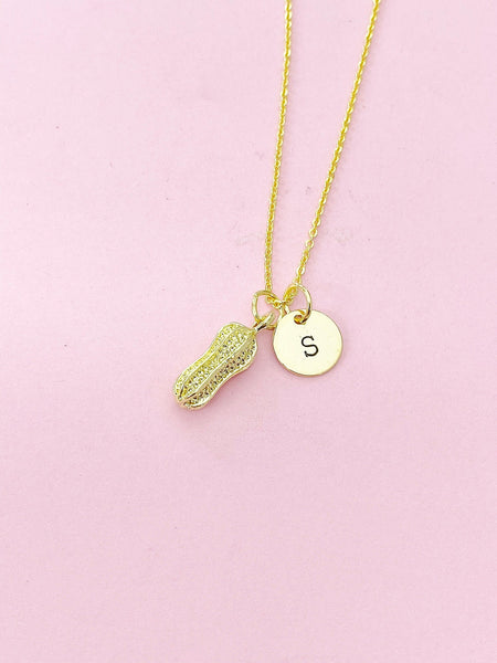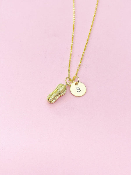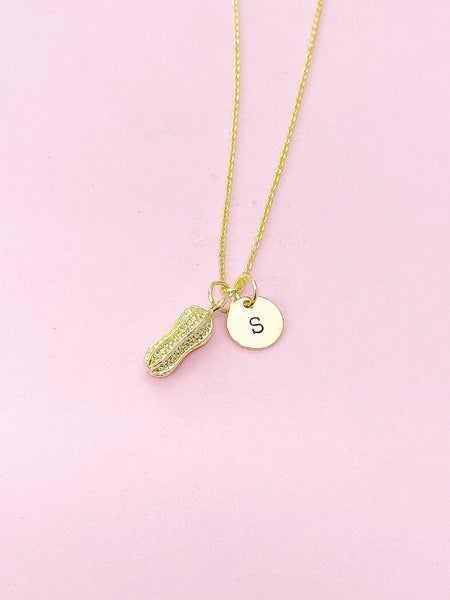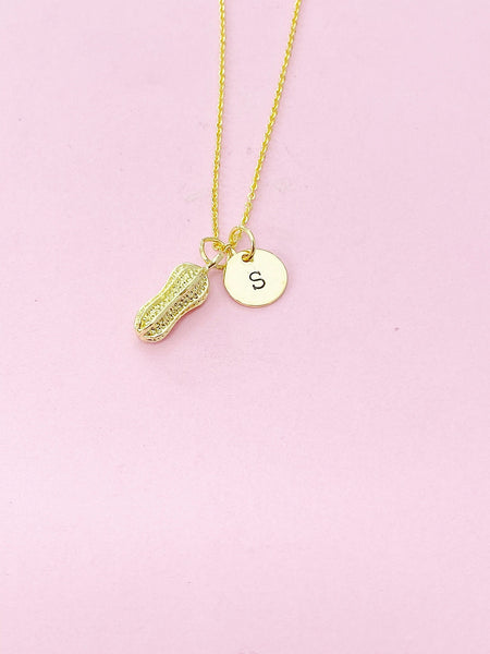 This is gold tone Peanut charm with hand stamped initial charm on brass or stainless-steel chain.