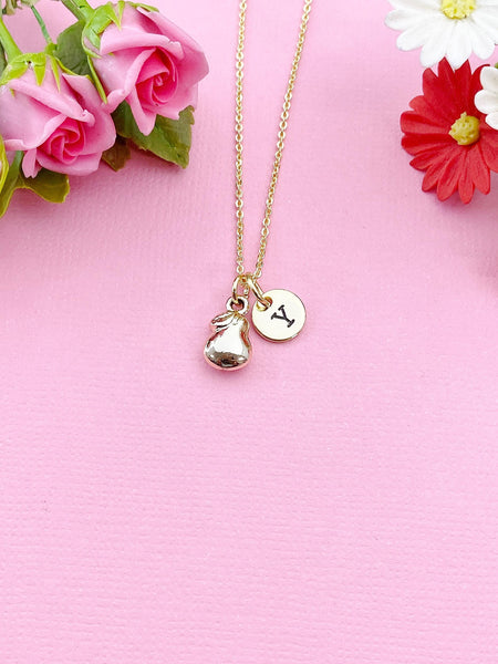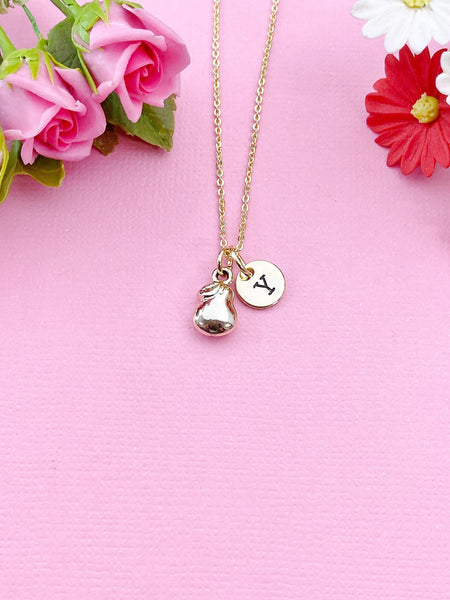 This is a gold -tone pear charm with hand stamped initial charm on brass or stainless steel 18 inches chain.