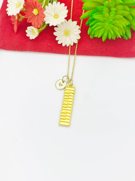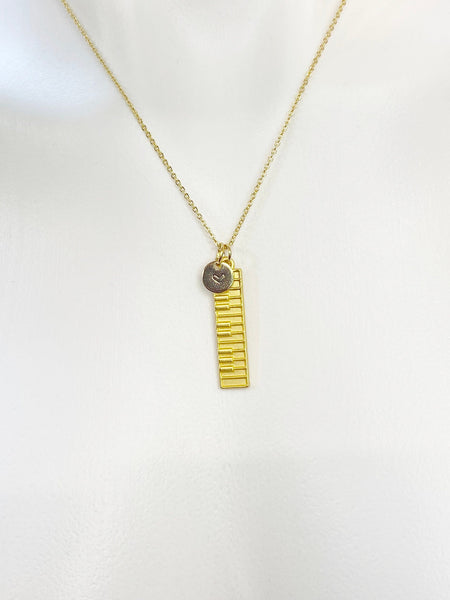 This is a gold -tone piano keybord charm with hand stamped initial charm on stainless steel or brass chain.
