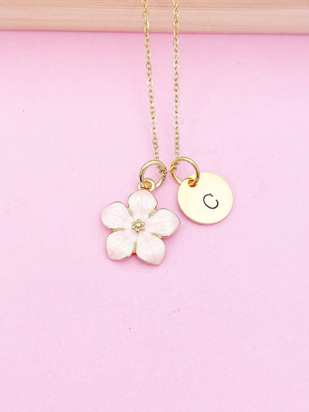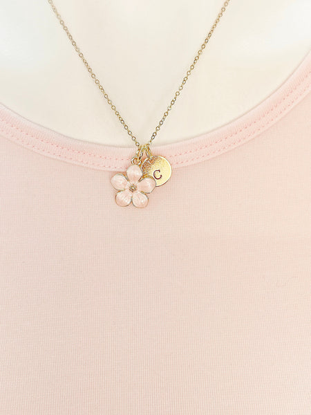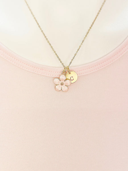 This is gold tone pink flower charm with hand stamped initial charm on brass or stainless steel 18 inches chain.