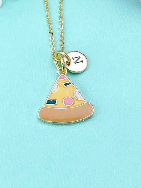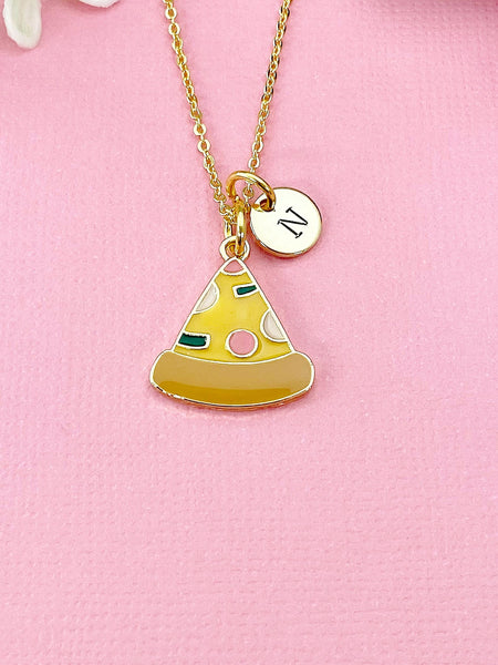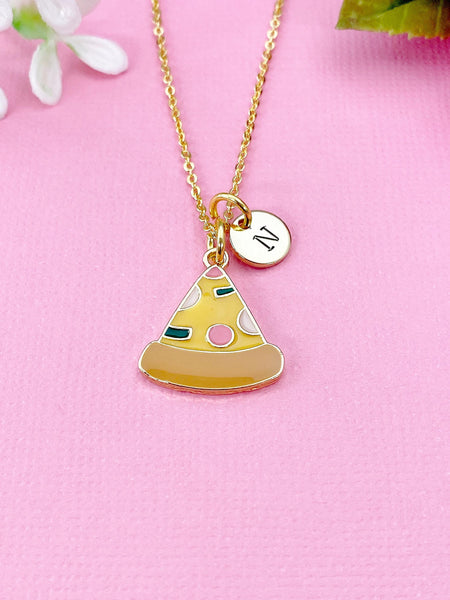 This is a gold tone pizza charm with hand stamped initial charm on stainless steel 18 inches chain.