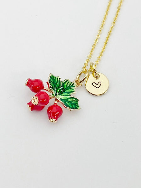 This is a gold tone pomegranate charm with hand stamped initial charm on a stainless-steel or brass chain.