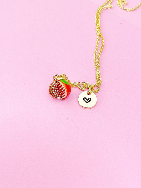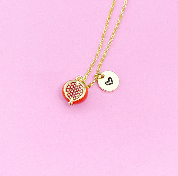 This is a gold tone pomegranate charm with hand stamped initial charm on a stainless-steel or brass chain.